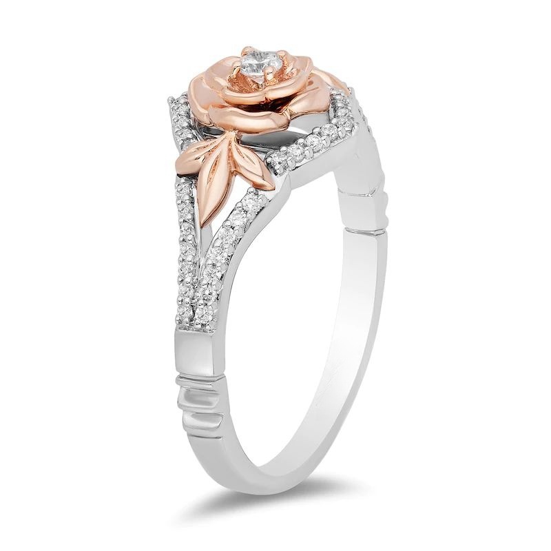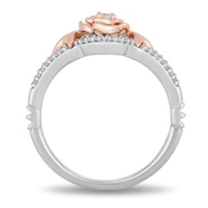 Displaying elegance this diamond rose ring is an unparallelled beauty. Crafted in sterling silver and 10K rose gold, this exquisite choice showcases a 0.04 ct. diamond shimmering in a radiant bloom flanked by trios of detailed leaves – all in rose gold. The diamond-lined chevron-shaped ribbons of the silver surround the centre in sparkle. Captivating with 0.18 ct. t.w. of diamonds and a bright polished shine, this design makes any day special.