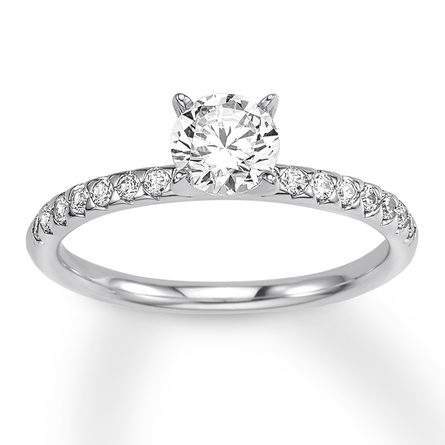 This timeless engagement ring is graced with a sparkling 5/8-carat round diamond center. More diamonds glisten along the band to complement, bringing the total diamond weight to 3/4 carat. The ring is fashioned in 14K white gold.