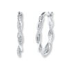 These graceful hoop earrings feature waves of sparkling round diamonds entwined with high-polish waves of sterling silver. Secured with hinged backs, the earrings have a total diamond weight of 1/8 carat.Item #: 507577308Content + CareThis item is electroplated with rhodium or finished with an e-coating. These finishes may wear off with frequent use. Ask a jewelry consultant for details.